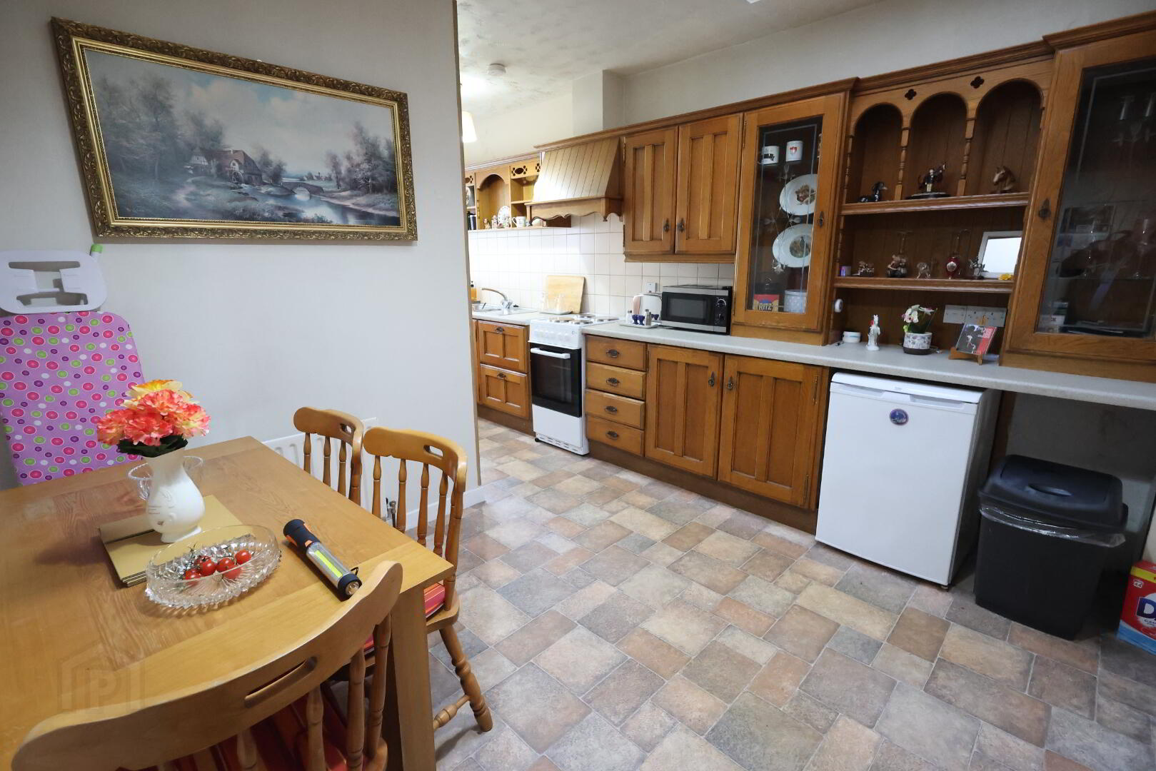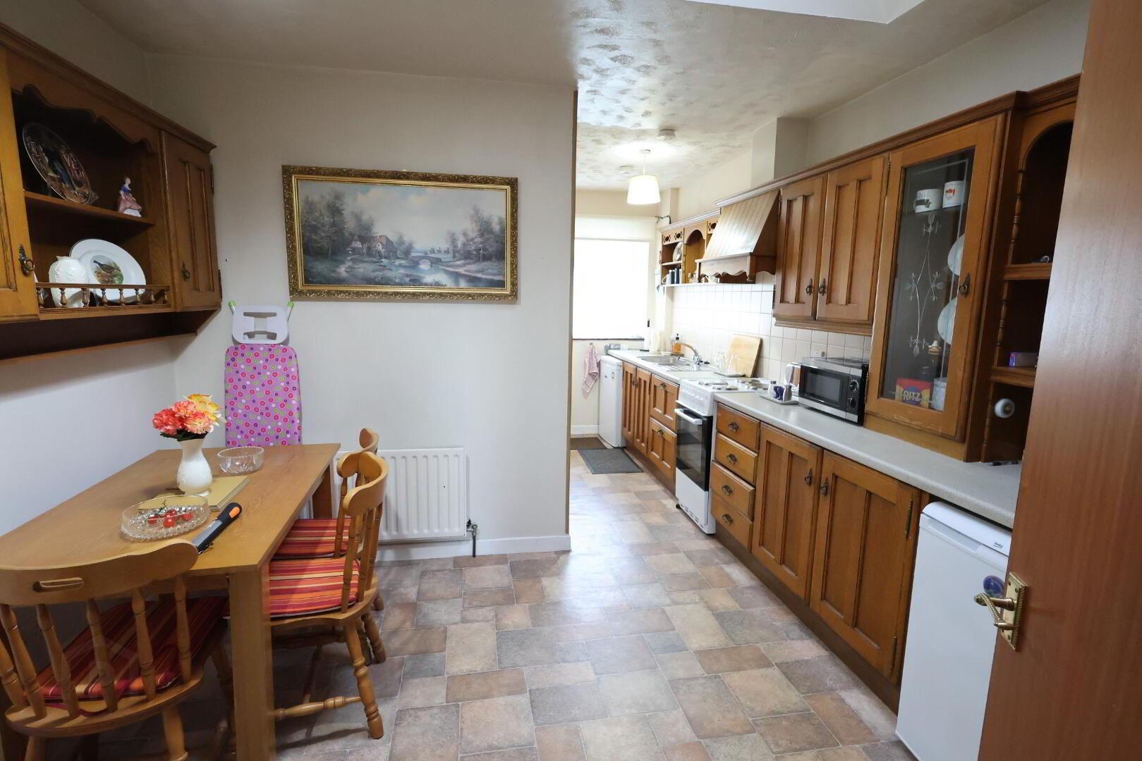 Kitchen Dinette: 18’06” x 11’03” (5.65m x 3.43m) Range of high & low level solid Oak units with glass display, 1 ½ stainless steel sink unit with single drainer, 3 x double power points, 1 x single & 1 x double radiator, Flavel electric cooker, Beko fridge, telephone point, under stair storage, velux window, part tiled walls, vinyl floor.