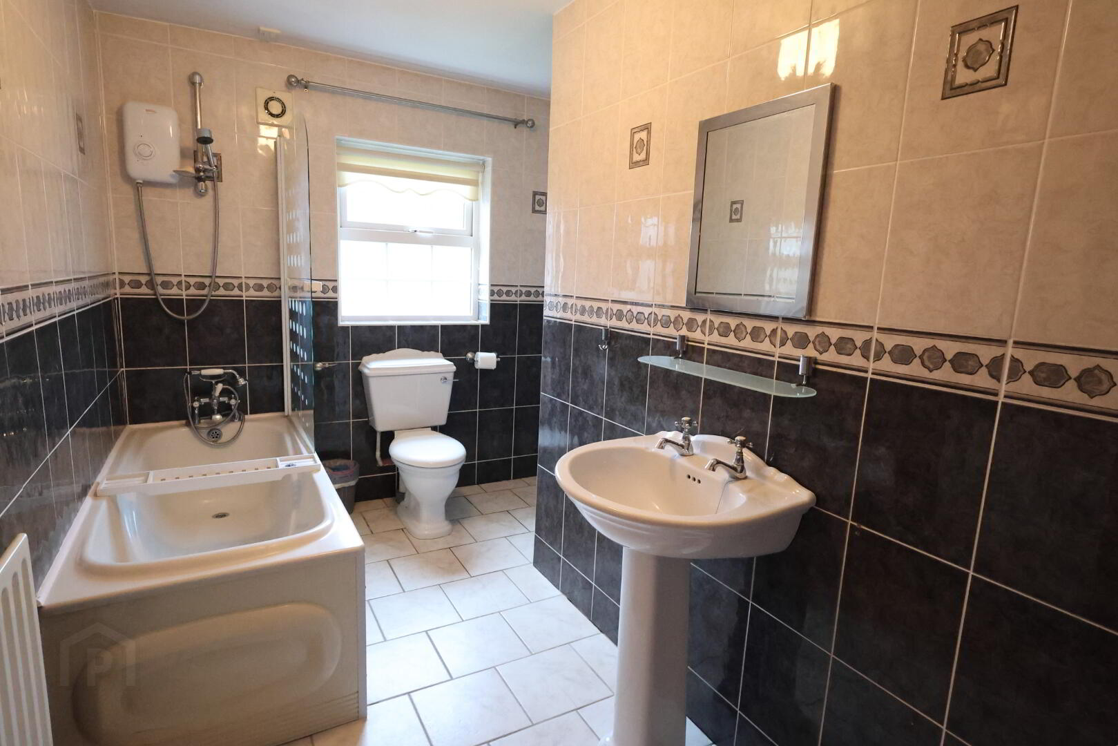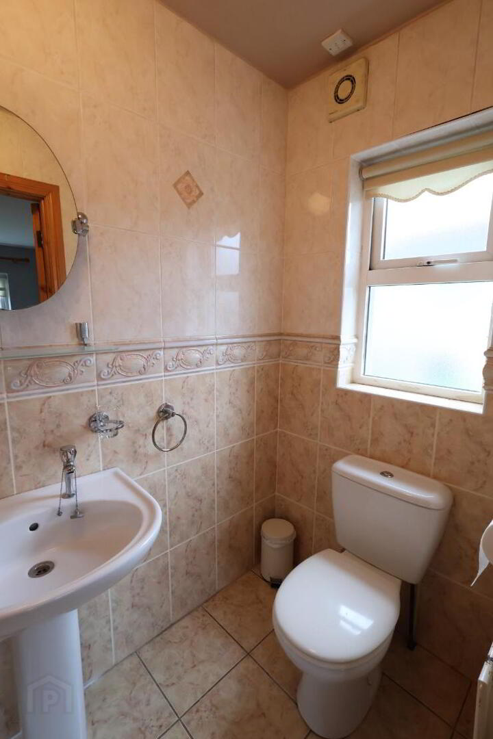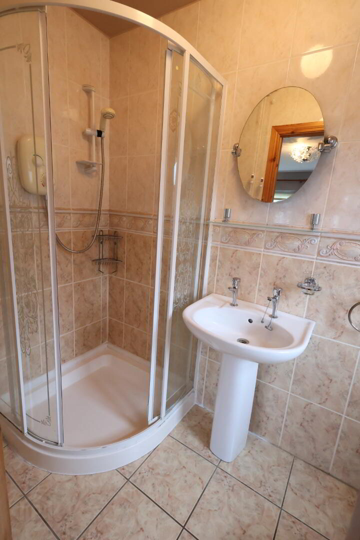 Bathroom : 10’09” x 9’01” (3.27m x 2.78m) White suite comprising of wc, pedestal sink unit, bath with electric Redring shower over, extractor fan, 1 x single radiator, tiled walls, tiled floor.