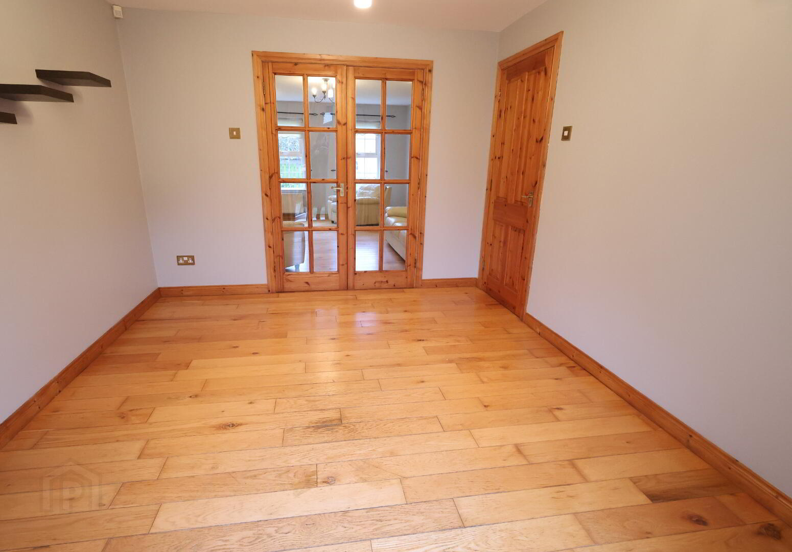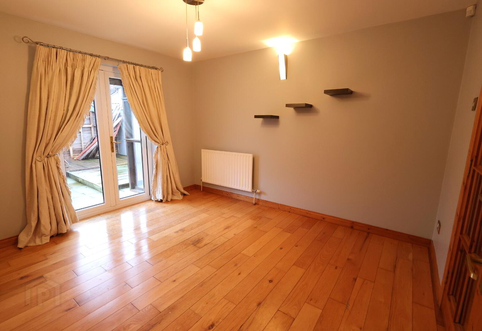 Dining Room: 11’02” x 9’07” (3.40m x 2.94m) 2 x double power points, 1 x single radiator, 2 x wall lights, solid wooden floor, double patio doors leading to outside patio area.