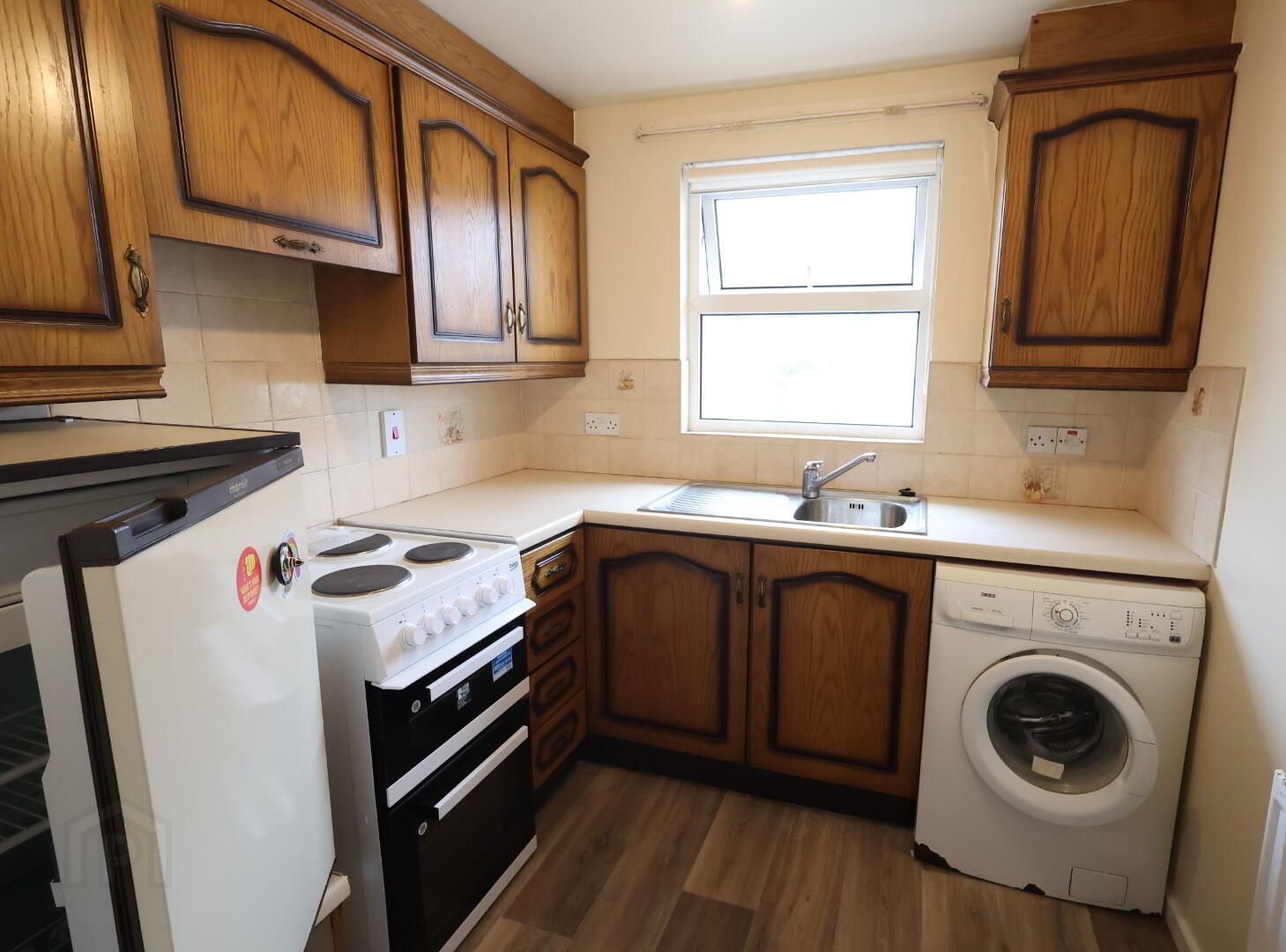 Kitchen: 9’10” x 7’04” High & low level solid oak kitchen units with stainless steel single drainer sink unit, free standing electric cooker, extractor fan in wooden canopy, fridge, washing machine, 3 x single & 1 x double power points, 1 x single radiator, part tiled walls, vinyl floor, hot press with internal immersion.