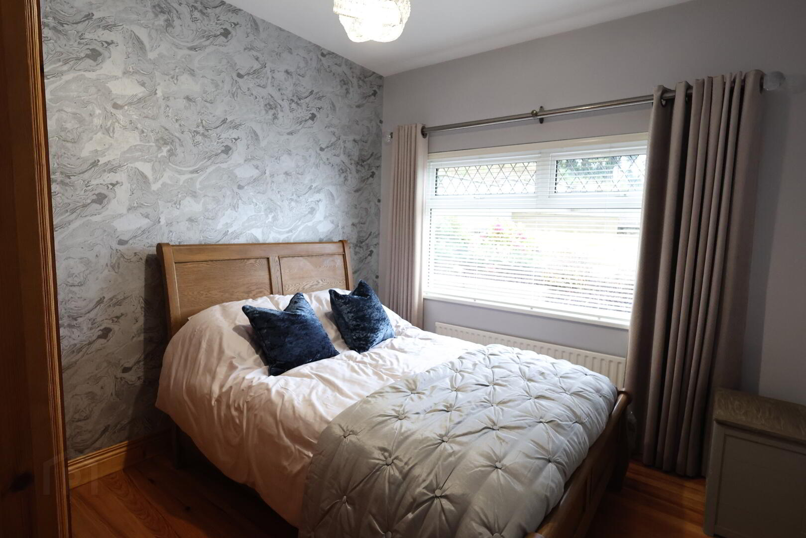 Bedroom 1: 10’06” x 9’04” (3.20m x 2.85m) 3 x double power points, 1 x single radiator, tv point, solid Pine wooden floor.