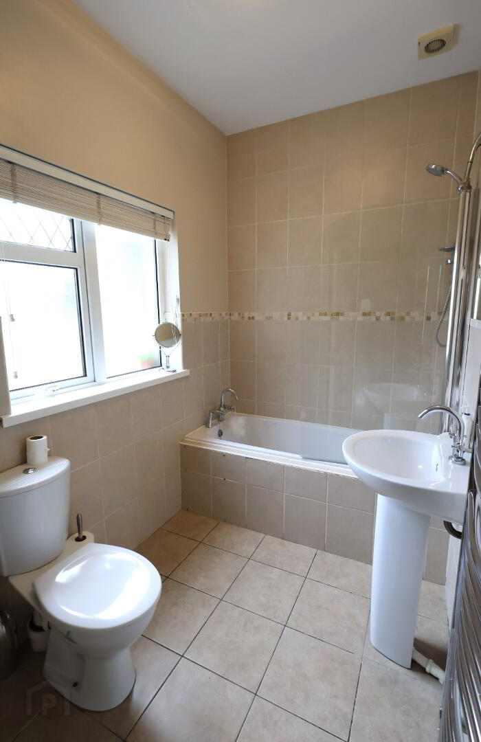 Bathroom: 10’06” x 5’04” (3.21m x 1.64m) Wc, pedestal sink unit, bath with electric Redring shower over, extractor fan, towel rail radiator, Hot press Willis water heater, part tiled walls, tiled floor.
