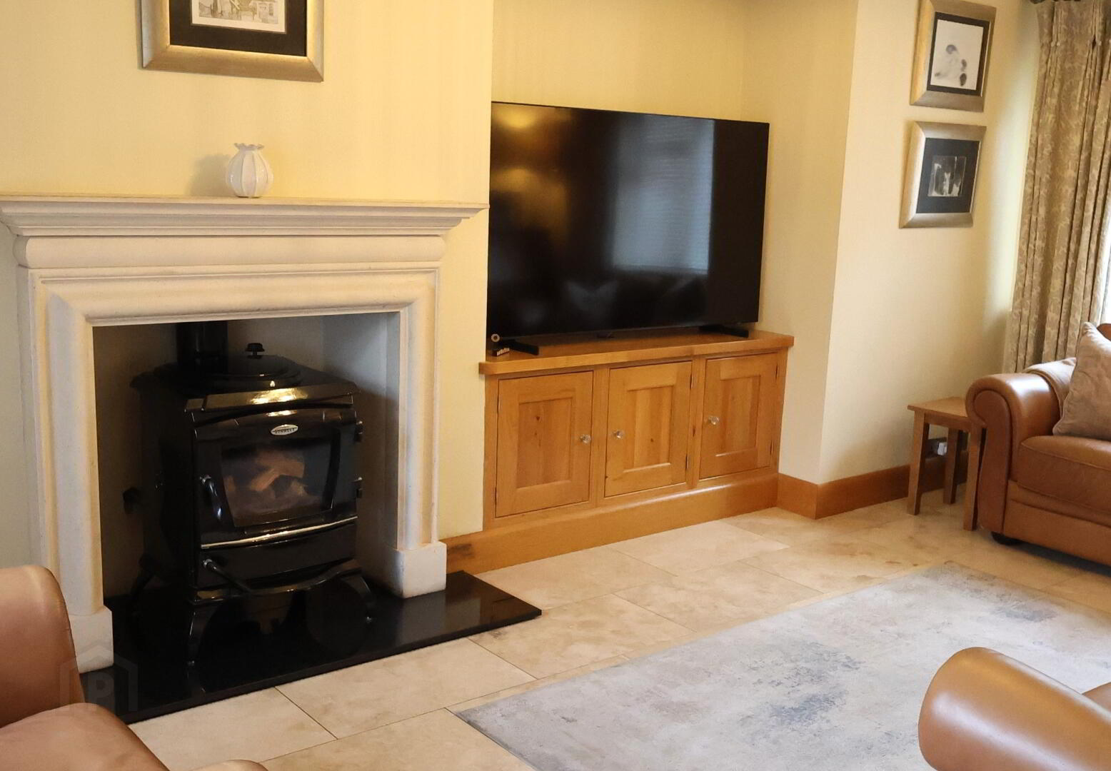 Sitting Room: 17’10” x 11’07” (5.45m x 3.53m) Enamel Stanley stove in sandstone surround with back boiler & granite hearth, 2 x double radiators, wall & ceiling cornice, built in Oak TV unit, tiled floor matching hall.