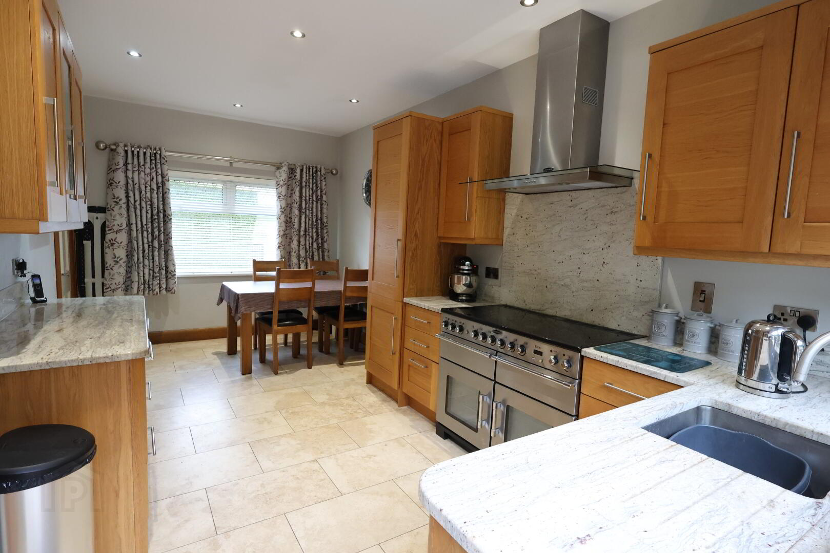 Kitchen: 17’11” x 9’03” (5.46m x 2.83m) Range of high & low level solid Oak units, single stainless steel sink unit with recessed drainer, raised granite worktop & windowsills, 1 x single & 5 x double power points, 2 x vertical stainless steel radiators, recessed lights, tv point, Rangemaster cooker, larder, tiled floor.