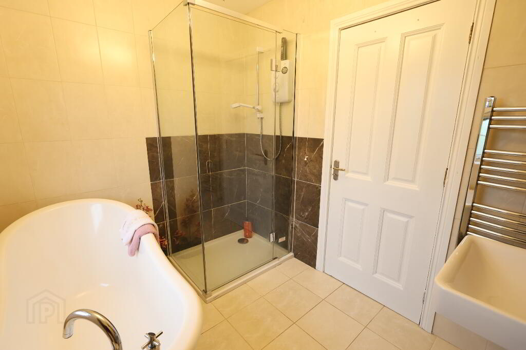 Bathroom: 8’04” x 6’09” (2.56m x 2.07m) White suite comprising of wc, pedestal unit with wall light and wall mounted cabinet, free standing roll top bath, separate electric Mira shower, extractor fan, chrome towel rail radiator, tiled walls, tiled floor.