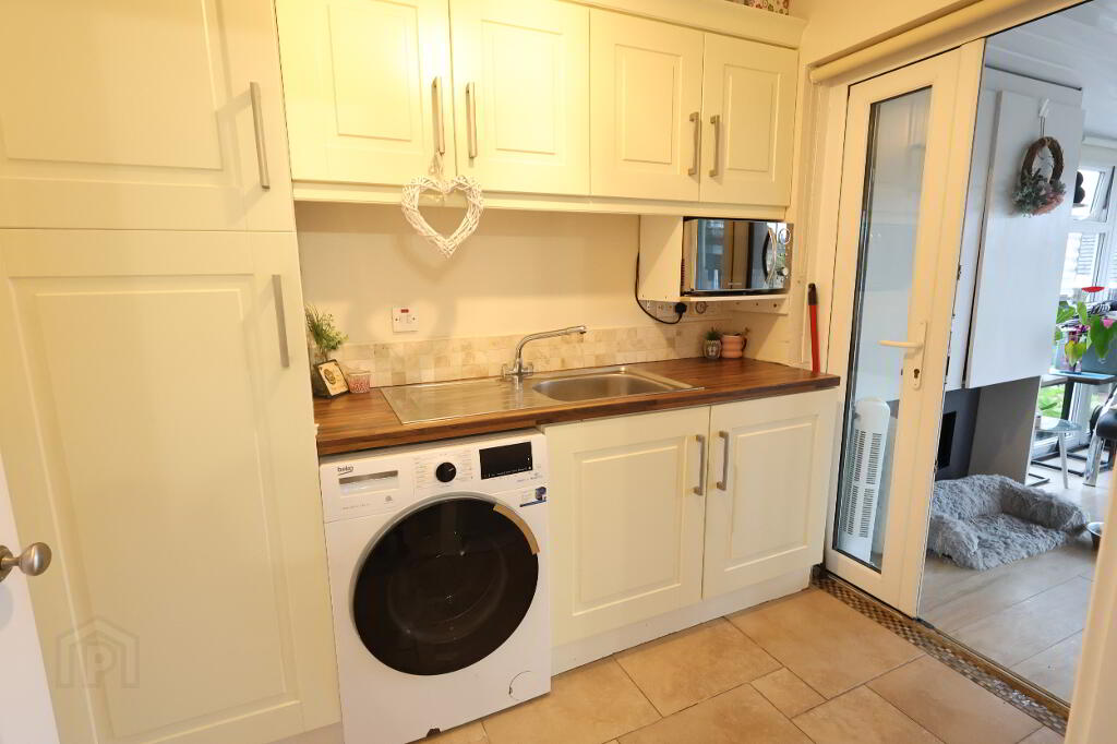 Conservatory: 11’10” x 9’11” (3.60m x 3.02m) Feature electric inset, 2 x double power points, 1 x double radiator, PVC ceiling with recessed lights, plumbed for sink unit, heavy duty laminate floor.