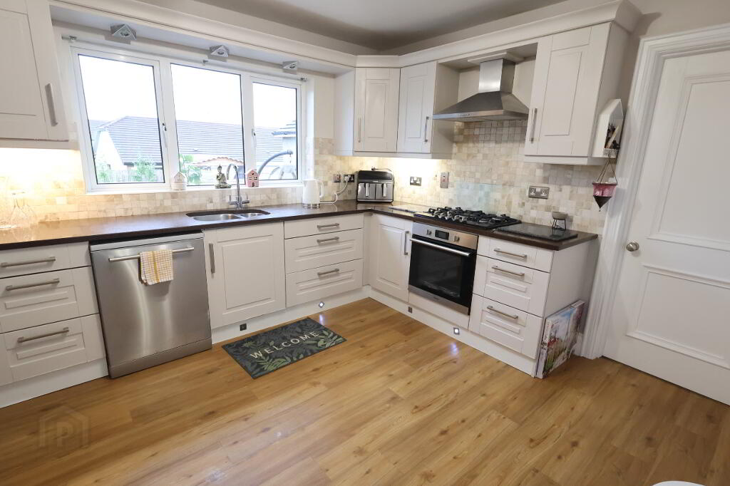 Kitchen: 12’07” x 11’02” (3.85m x 3.40m) Range of high & low level shaker style kitchen units, 1 ½ stainless steel sink unit with granite recessed drainer, pelmet lighting, kickboard lighting, 4 x double power points, 1 x double radiator, Hotpoint oven, Belling gas hob, extractor fan in stainless steel hood, tv point, part tiled/ part wooden panel walls, heavy duty laminate floor.