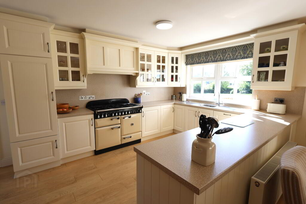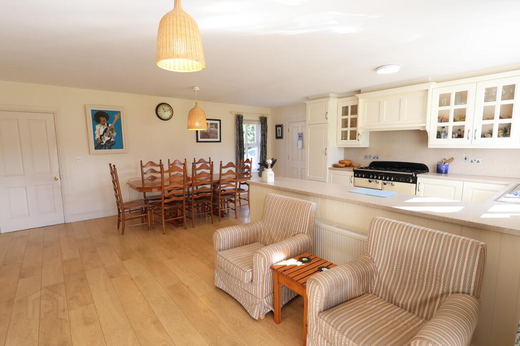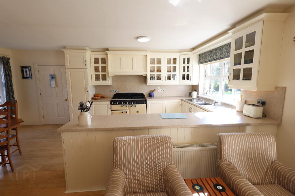 Kitchen/ Dining/ Living Area: 19’05” x 19’00” (5.91m x 5.80m) Range of high and low level solid units with glass display cabinets, single stainless steel sink unit with double drainer, raised worktop splashbacks, 6 x double power points, 1 x triple power point, 2 x double radiators, Range Master gas hob & electric ovens, Hotpoint fridge, Bosch dishwasher, tv point, extractor fan in feature mantle style wooden canopy, heavy duty laminate floor, double glass panel doors leading to sunroom.