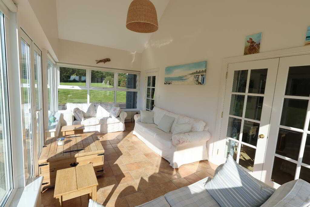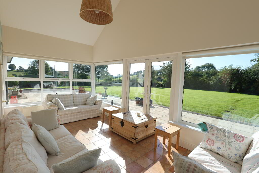 Sunroom: 20’00” x 9’10” (6.14m x 3.00m) 4 x double power points, 2 x 20 amp lamp sockets, 2 x double radiators, tv point, vaulted ceiling, tiled floor, glass panel double patio doors leading to large patio area & large side gardens.