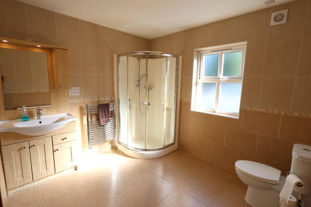 Downstairs Shower Room: 9’00” x 9’03” (2.83m x 2.75m) Wc, combined vanity unit & cabinet, separate system shower pod, extractor fan, 1 x double radiator, chrome towel radiator, tiled walls, tiled floor