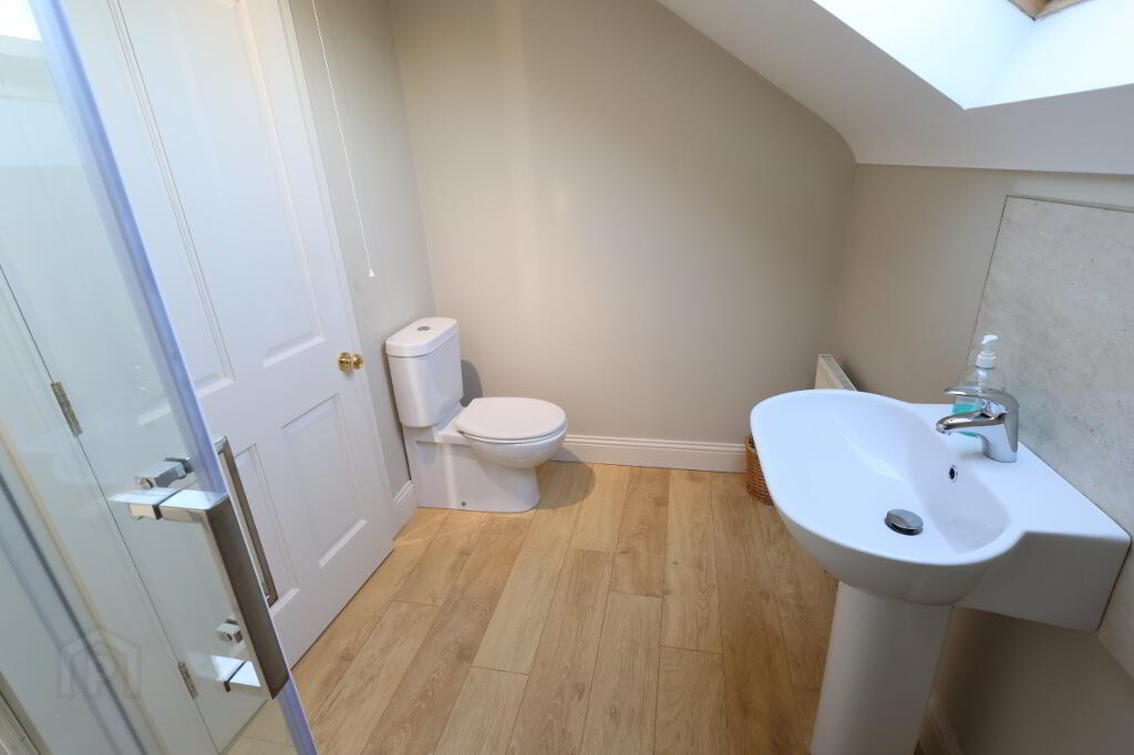 En-suite: 9’03” x 4’08” (2.83m x1.42m) Wc, whb with splash back tiling, shower pod, extractor fan, 1 x single radiator, velux window, heavy duty laminate floor.