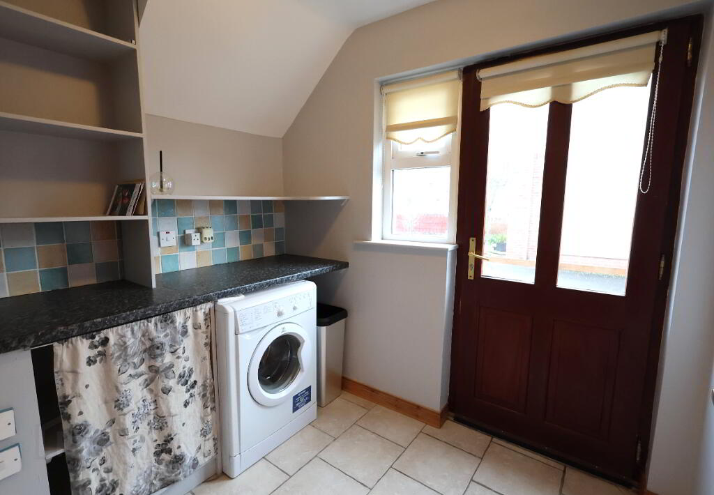 Utility Room: 7’05” x 5’11” (2.28m x 1.81m) Shelving, 1 x double power point, 1 x single radiator, plumbed for washing machine, part tiled walls, tiled floor.