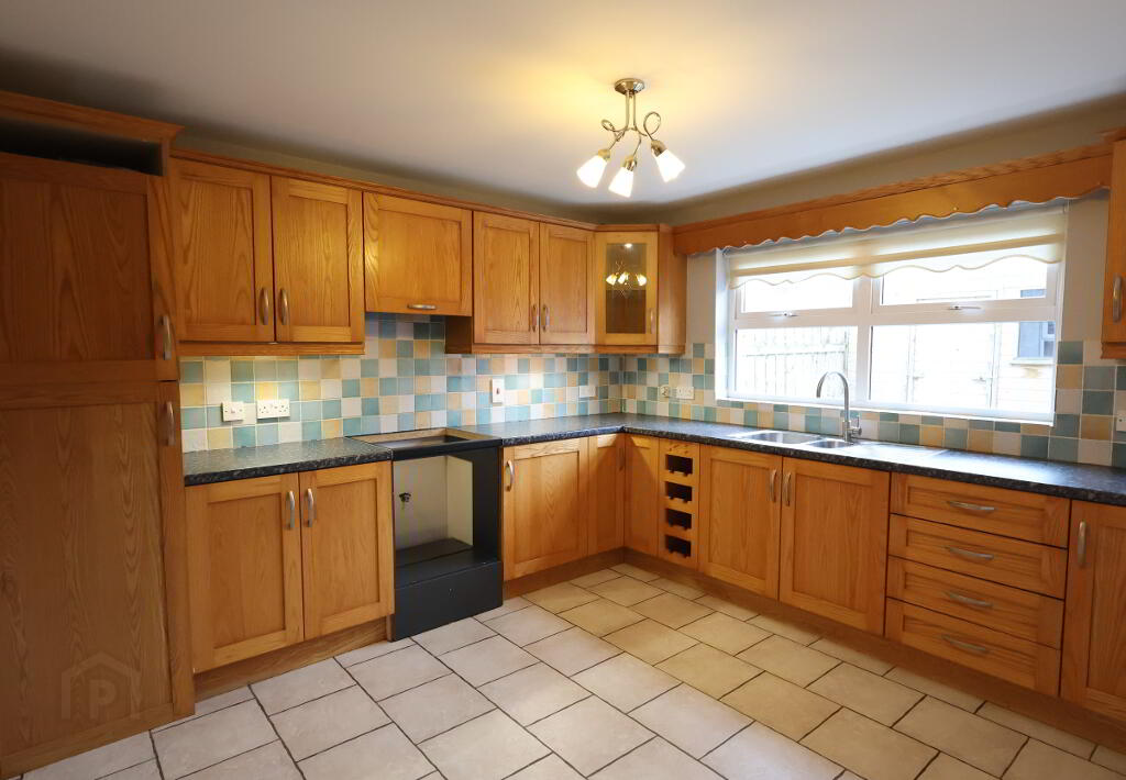 Kitchen: 11’06” x 10’06” (3.50m x 3.21m) Range of high & low level solid units with glass display units & pelmet lighting, stainless steel 1 ½ sink unit with single drainer, 4 x double power points, 1 x single radiator, Ignis fridge freezer, extractor fan in wooden canopy, part tiled walls, tiled floor.