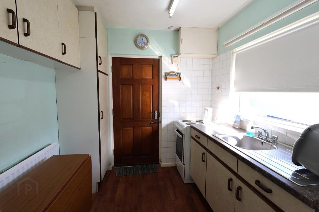 Kitchen: 9’03” x 7’04” (2.82m x 2.25m) Range of high & low level units, single stainless sink unit with single drainer, 1 x single & 1 x double power point, 1 x single radiator, Normende cooker, Lec Fridge, part tiled walls, vinyl floor.