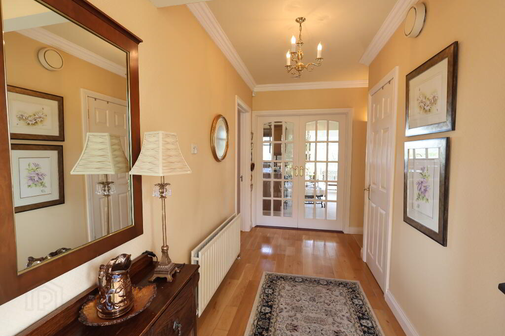 Entrance Hall: 1 x single & 1 x double power point, 1 x double radiator, wall cornice, wall uplighters, cloakroom & hot press, solid Oak floor.