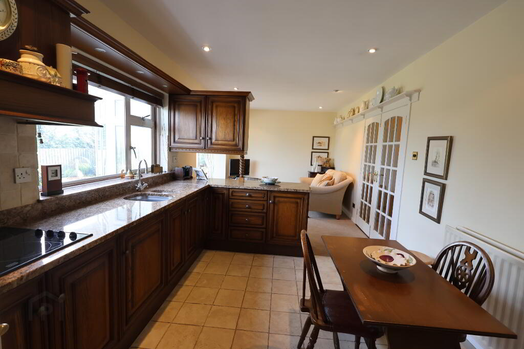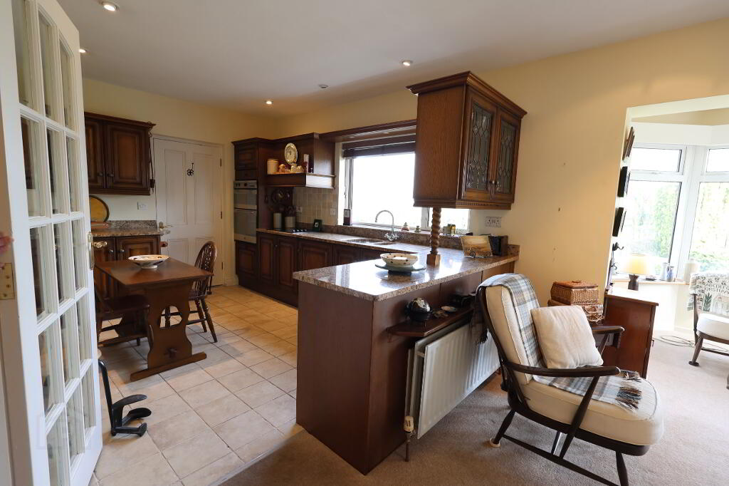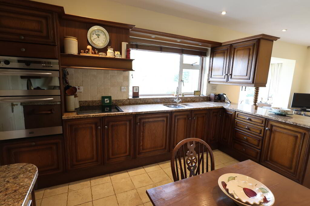 Kitchen: 12’01” x 9’06” (3.69m x 2.90m) Range of high & low level solid Oak units with glass display cabinet, 1 ½ stainless steel sink unit, granite worktop with recessed single drainer & raised splash back, 1 x single & 2 x double power points, 1 x double radiator, Creda hob & Creda double oven with grill, extractor fan in wooden canopy, Electrolux fridge, recessed lights, pelmet lighting, part tiled walls, tiled floor.