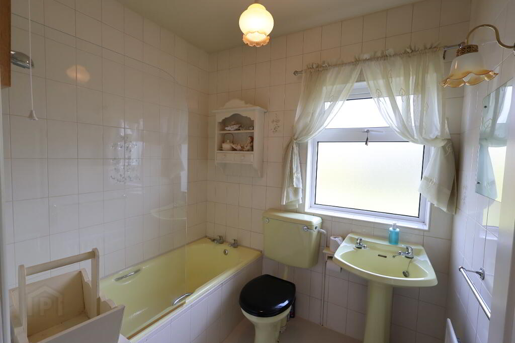 Bathroom: 9’08” x 6’06” (2.95m x 1.99m) Yellow suite comprising of wc, pedestal unit, bath with electric Redring shower over,1 x single radiator, tiled walls, tiled floor.