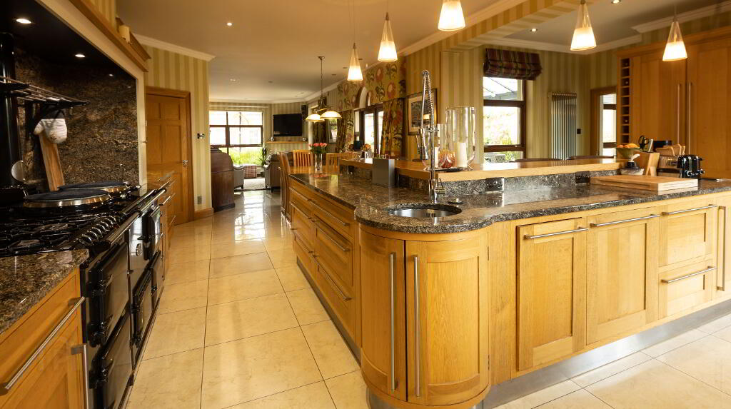 Kitchen: 22’11” x 15’08” (6.99m x 4.79m) Stunning range of solid Oak units with glass display cabinets, double larder with wine racks, granite worktop and raised splash back, stainless steel single sink unit with recessed double drainer, Aga oil fired range with gas hob & electric oven set in feature mantle with spice racks and recessed lights, 2 x Fisher & Paykel dishwashers, Gaggenau fridge, microwave & coffee machine, L-shape centre island/ breakfast bar with round stainless steel sink unit & chrome pull down spray tap, 6 x double power points, incorporating large range of drawers & cupboards, pendant lighting over, 2 x single & 5 x double power points chrome vertical radiator, wall cornice, recessed lights, tv point, tiled floor, open plan to Dining/ Living area.